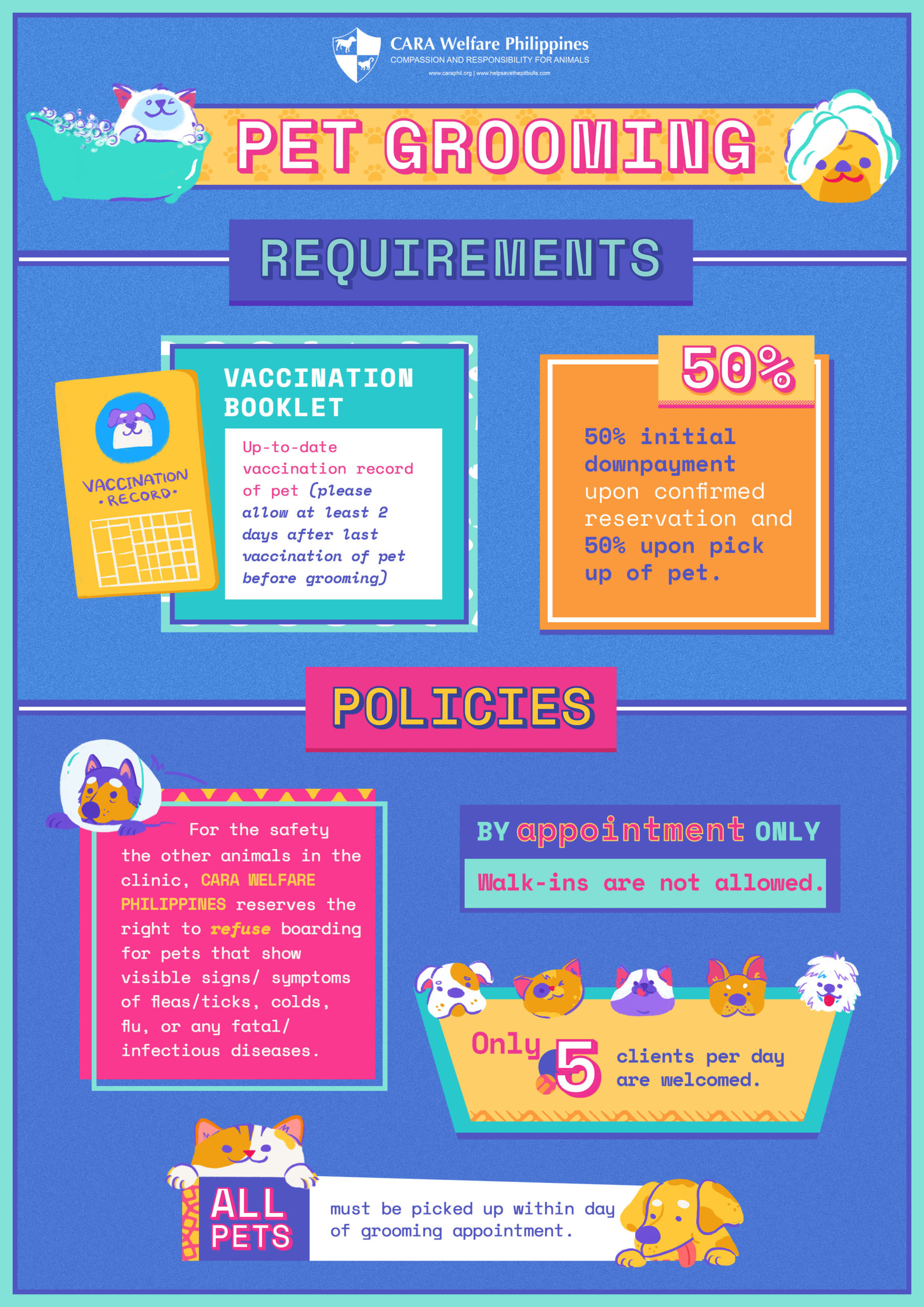 Abandoning pets is a crime under Republic Act No. 10631 (Amended Animal Welfare Act). CARA isn’t a shelter; if you can no longer care for your pet, please find them a loving home. Remember, having a pet is a big, lifelong commitment—they’re family.